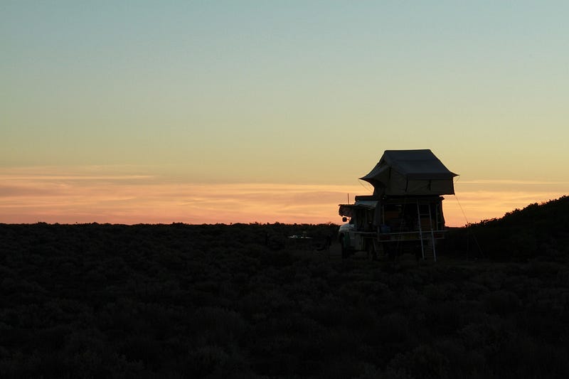 Despite its deficiencies in the floral department, the landscape sustains a whole range of critters — we spotted red kangaroos, emus, wedge-tailed eagles and feral camels from the highway, and heard rumours of hairy-nosed wombats and dingoes. By night the plain is covered in spiders the size of your palm, on the hunt for food. We know this because their eyes reflect the light from a headlamp, and everywhere we looked they glimmered back at us. We were happy to have a tent on the roof, although its flapping in the region’s notorious wind meant we didn’t sleep much.